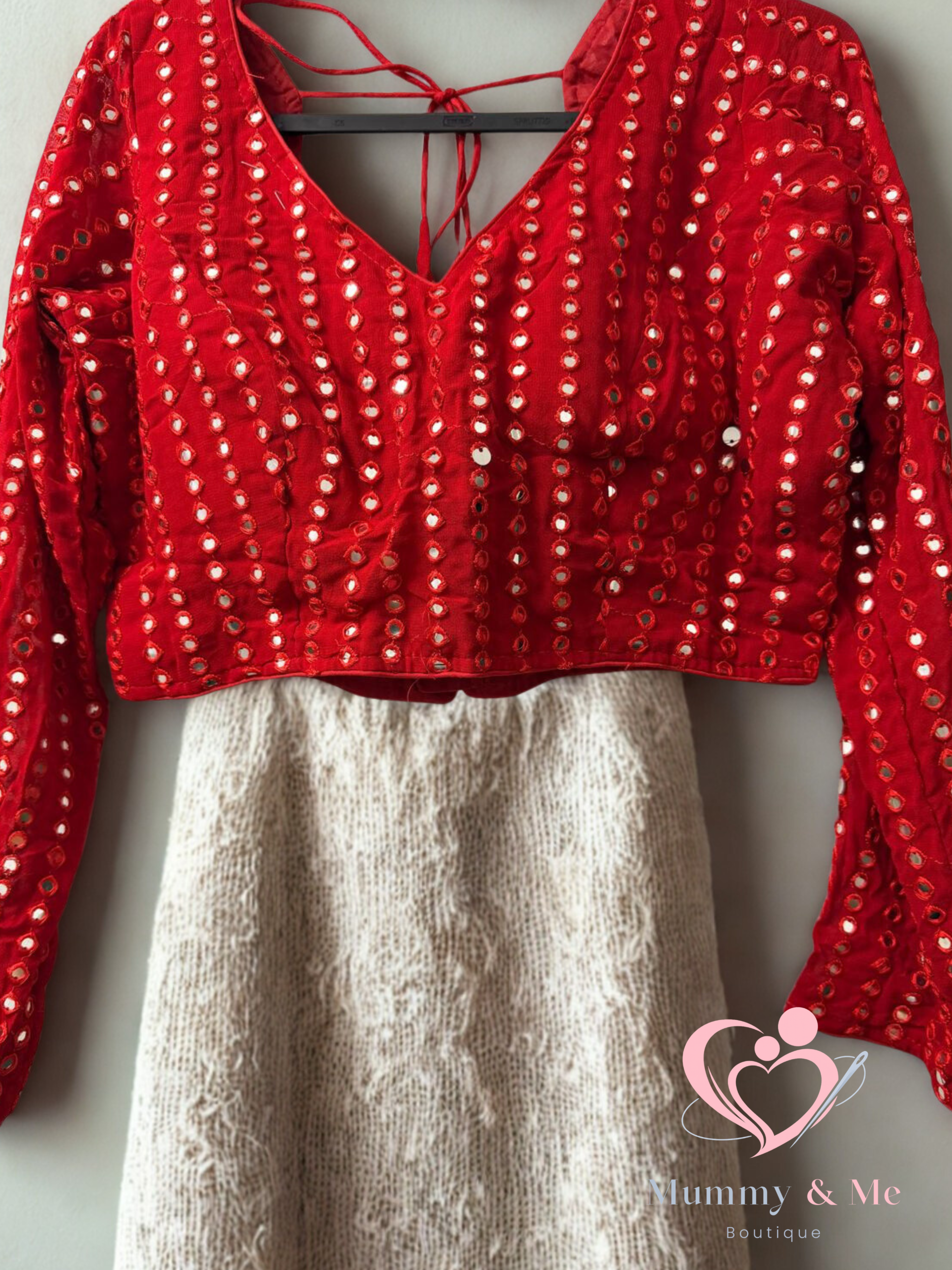This Red georgette  Designer Saree Blouse is a mirror work embroiderya ready-made saree blouse  . This features rows of small, circular mirrors secured with thread work, often in a repetitive vertical or geometric pattern.