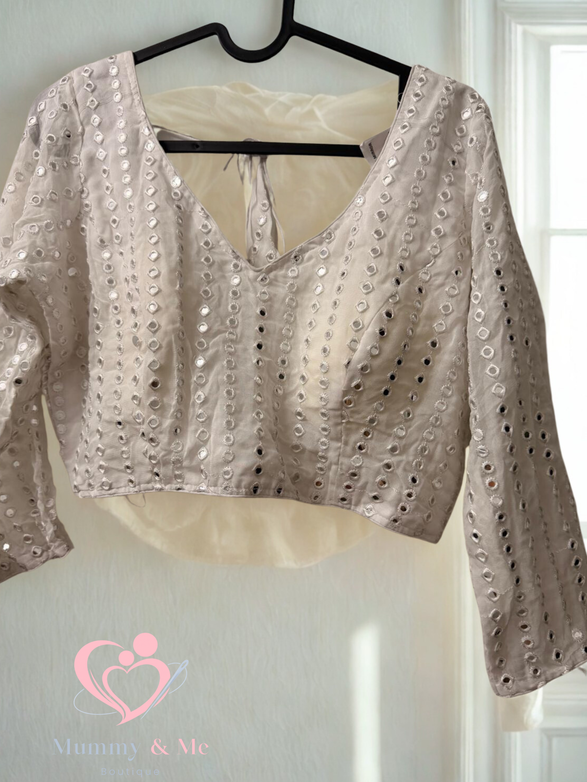 This White  georgette  Designer Saree Blouse is a mirror work embroiderya ready-made saree blouse  . This features rows of small, circular mirrors secured with thread work, often in a repetitive vertical or geometric pattern.
