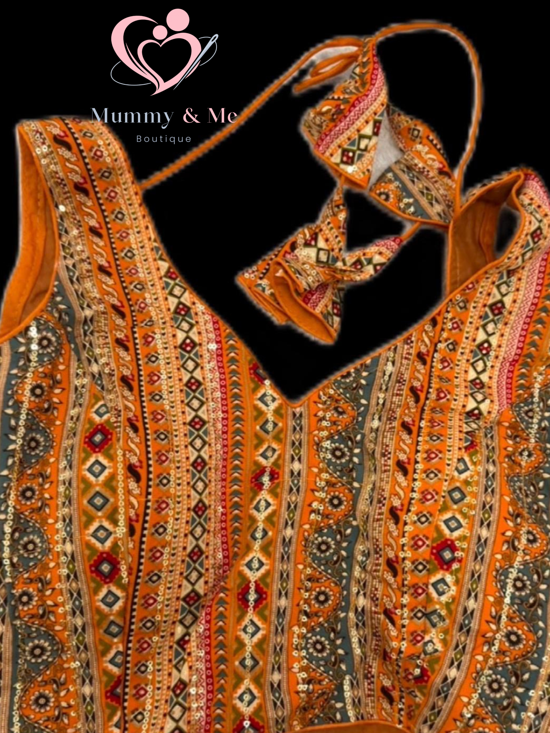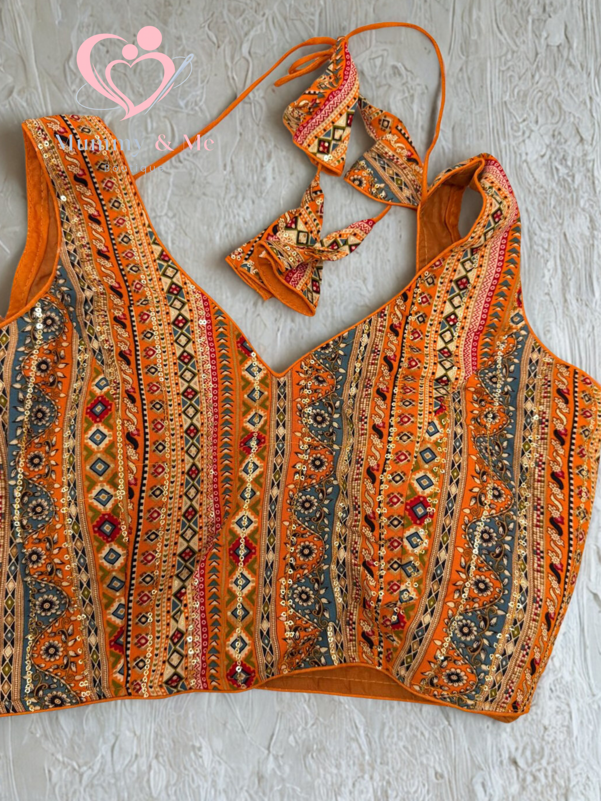 This Designer Saree Blouse is a ready-made saree blouse designed with a vibrant orange base, beautifully highlighted with multi-coloured geometric patterns and elegant foil printing.