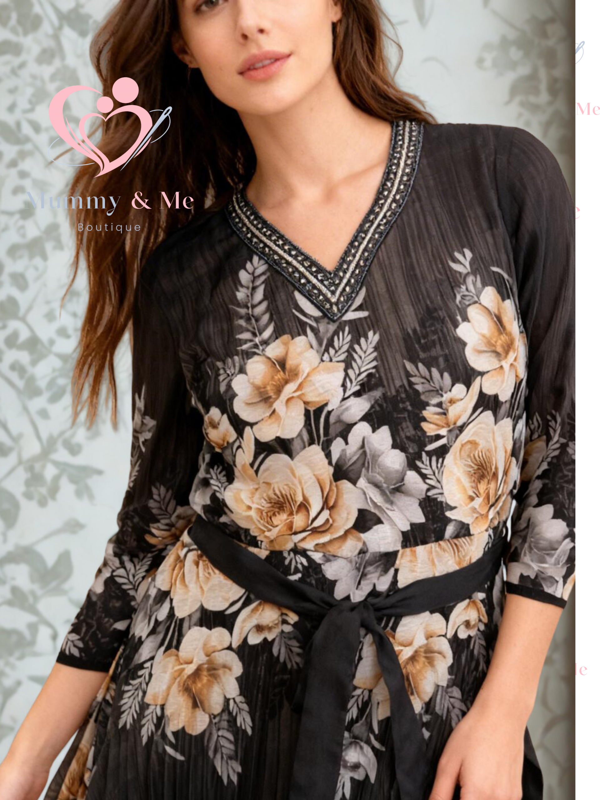 Floral print pleated chiffon dress   with an ornate beaded neckline.