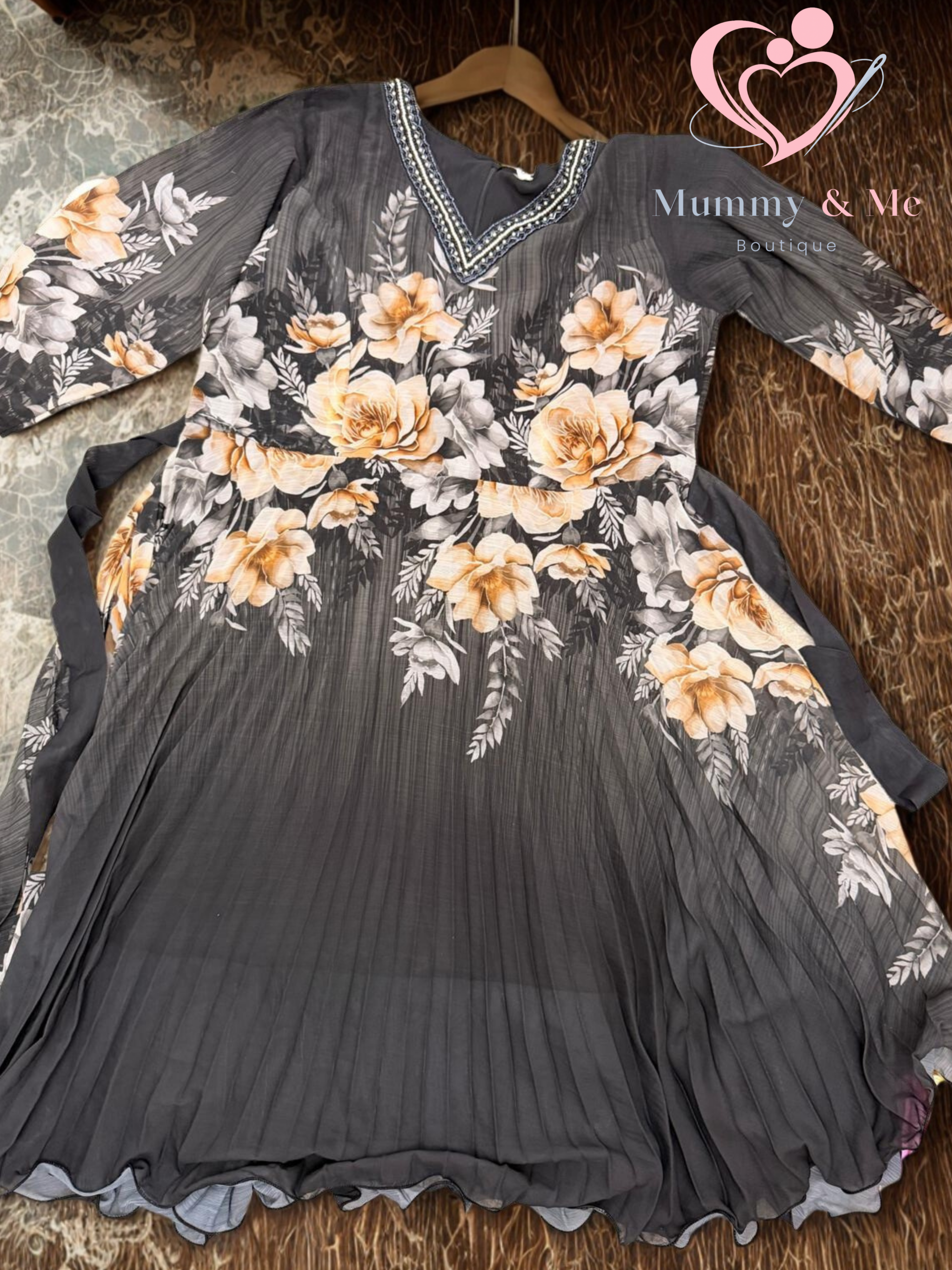 The garment features a dark background, likely charcoal or black, with large, stylized floral patterns in shades of beige, cream, and brown. The material is pleated chiffon