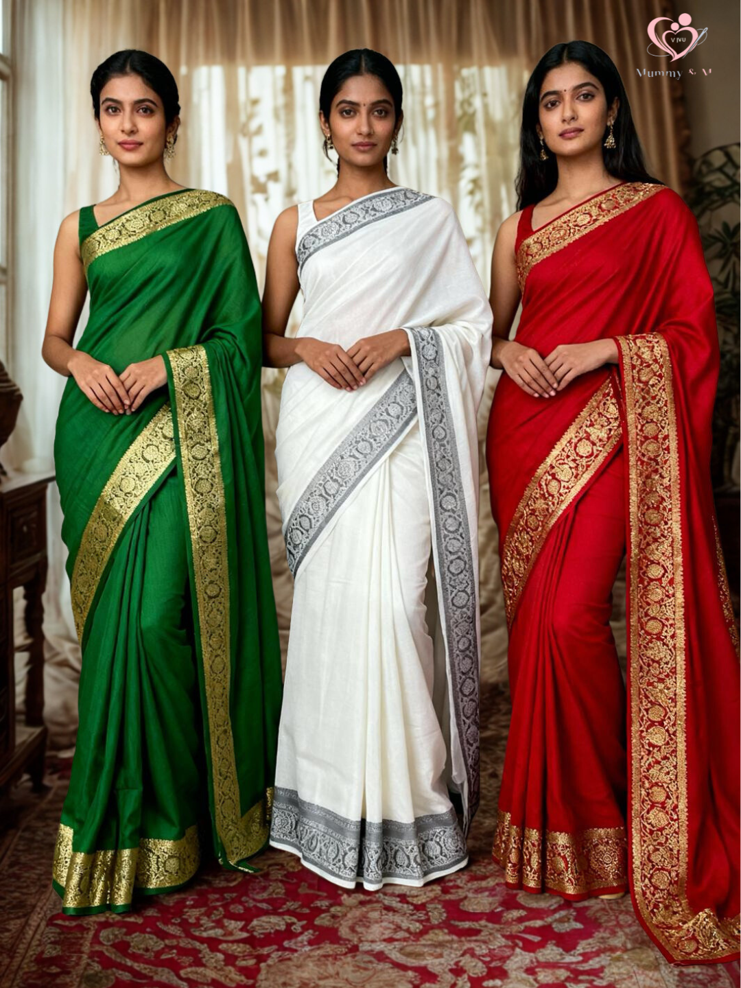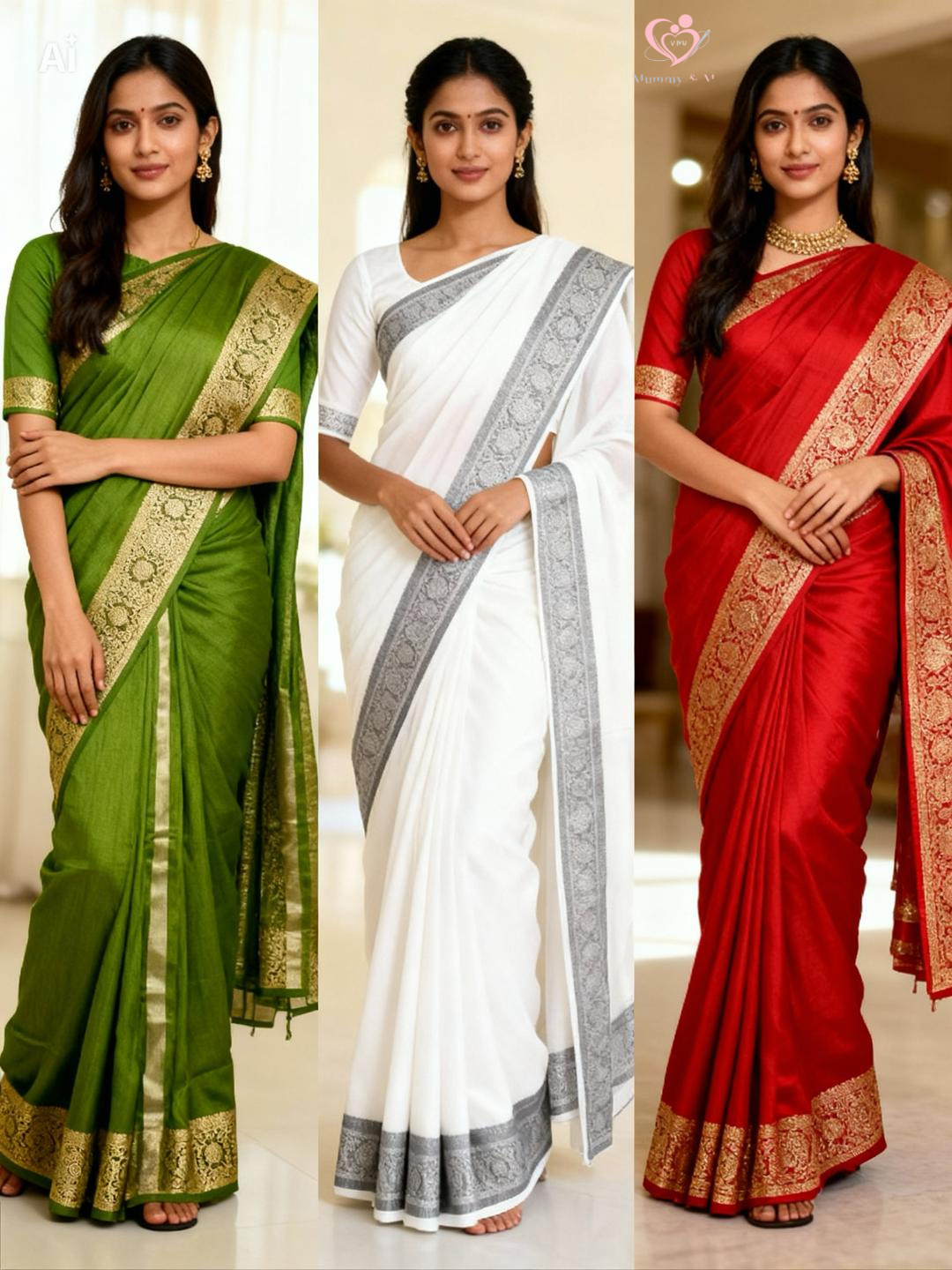 Green jute tissue linen saree featuring a distinct silver zari border. It is crafted from a blend of jute tissue linen and tissue yarns, which gives it a characteristic subtle sheen and a lightweight, breathable feel. The saree typically features a solid green body with a silver ribbed zari border and a matching panel pallu. This type of saree is valued for its contemporary look that combines the natural texture of linen with the festive elegance of tissue.