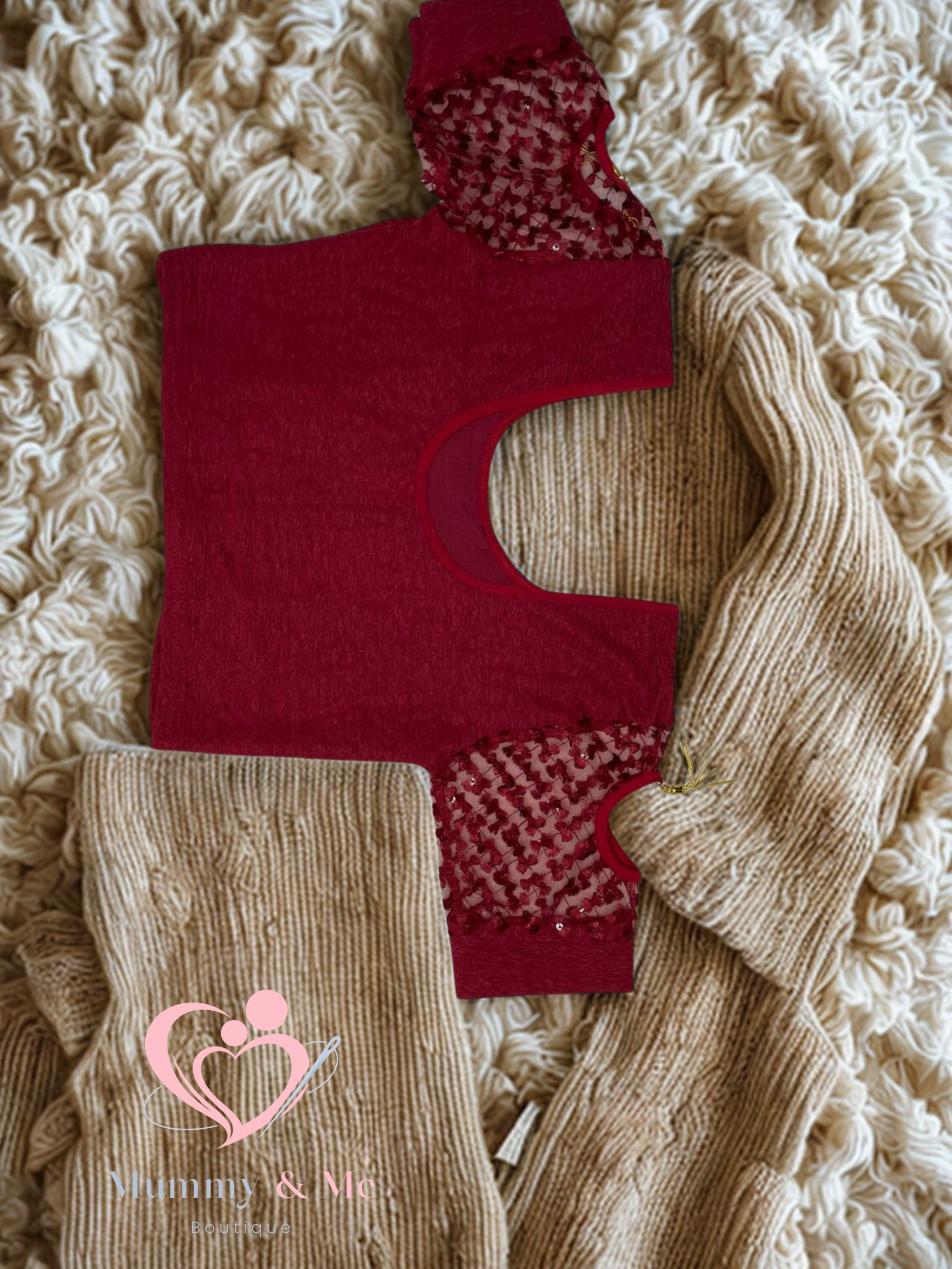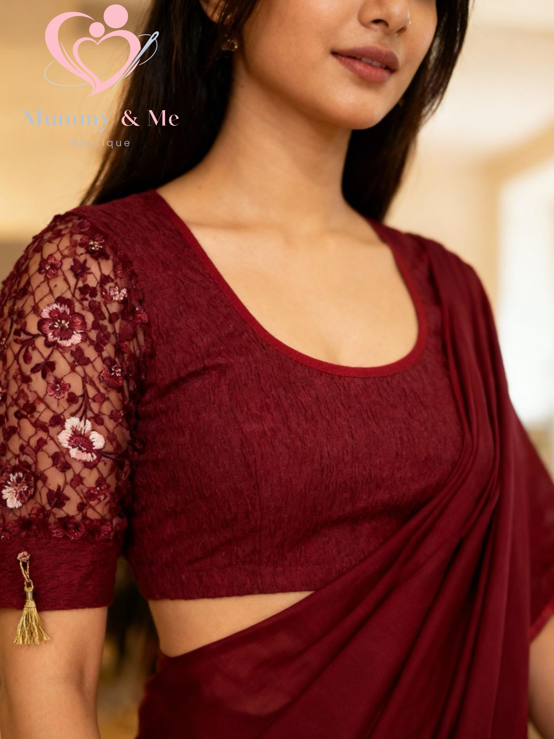 It is a readymade stretchable blouse, crush fabric / velvet to ensure a comfortable fit .