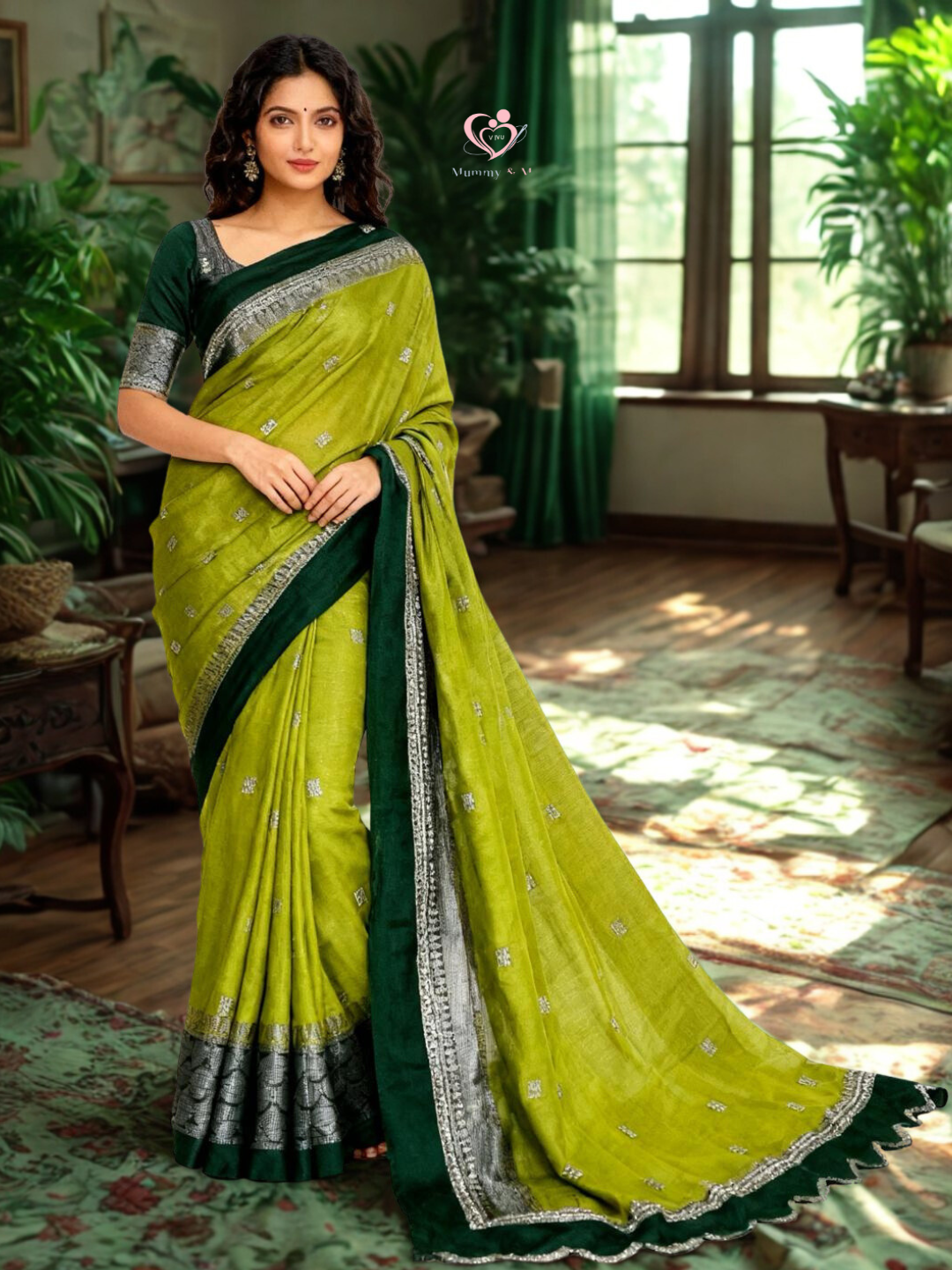 Semi soft silk lime green silk saree with a contrasting border. Lime green body with a contrasting dark green border. Typically crafted from high-quality soft silk, and rich texture. Design of the body often features intricate zari woven patterns or “butties” (small motifs), while the border and pallu. These sarees are highly popular for festive occasions, weddings, and traditional ceremonies.