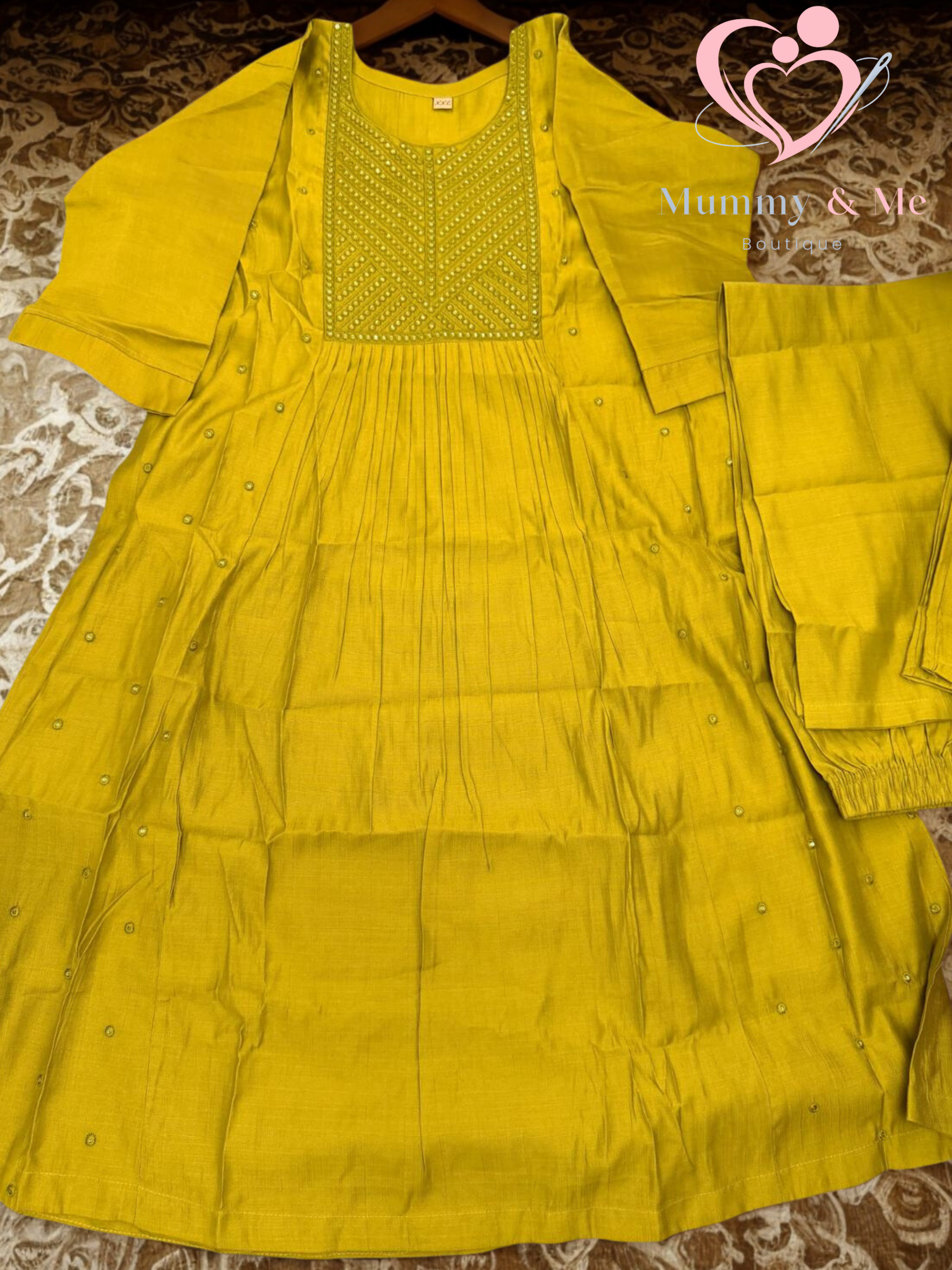 The design features a decorative embroidered yoke with geometric patterns and sequins, leading into a pleated or flared body.